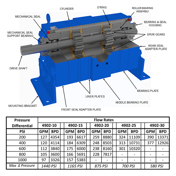 Northern’s Heavy Duty Twin Oil Gear Pump has been designed and developed to double the flow of our 4900 series of crude oil booster pumps. The twin set gear design produces twice the flow while maintaining our high pressure capability and long bearing life.
